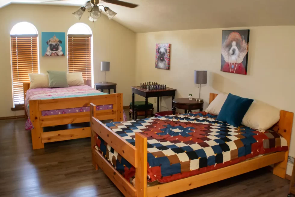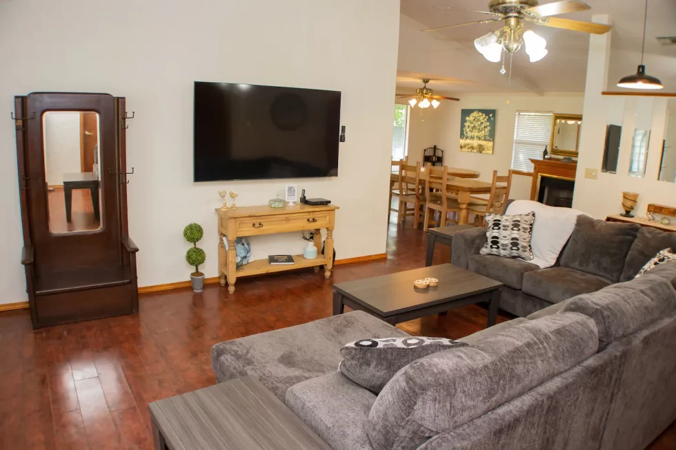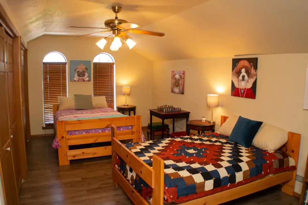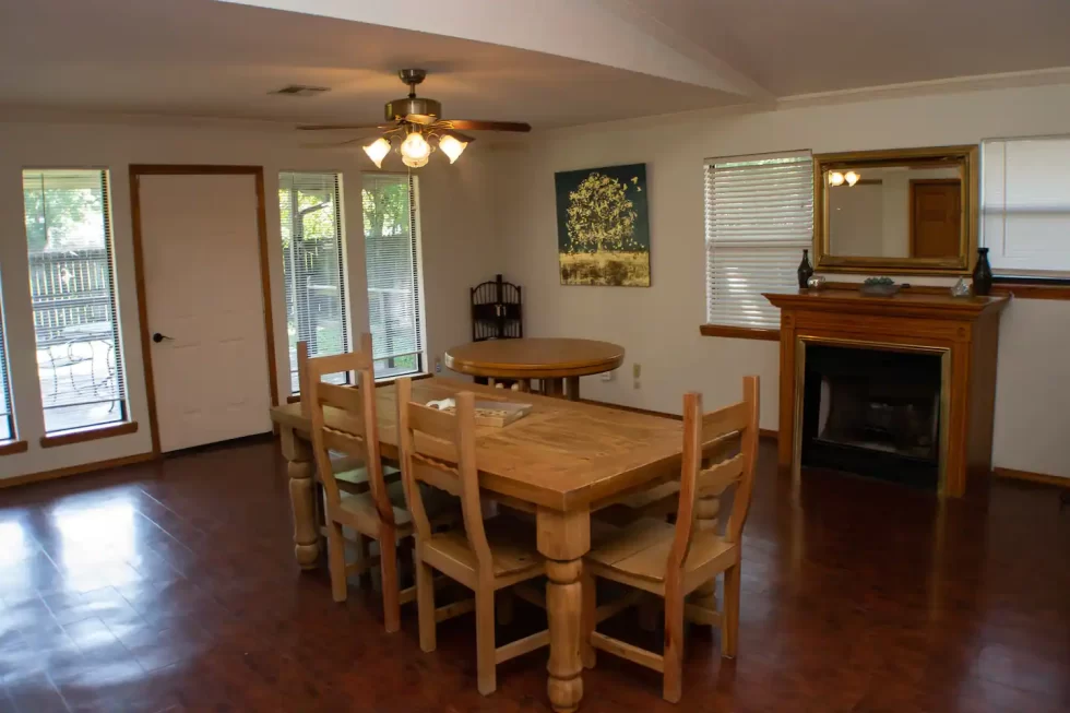 The perfect getaway for a family vacation and large enough for two families to vacation together. No cramped quarters in this spacious duplex. With plenty of games and entertainment on hand, this rental makes a great solution housing a diverse group. The full kitchens and outdoor grill allow you the freedom to plan chill evenings with family eating your favorite comfort foods. Or you can hit up one of the local eateries from this central downtown location.